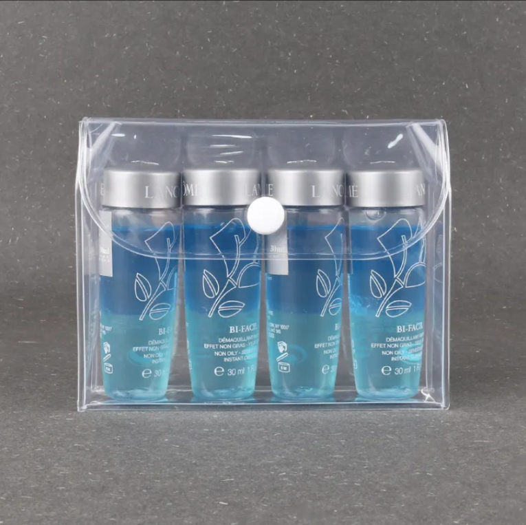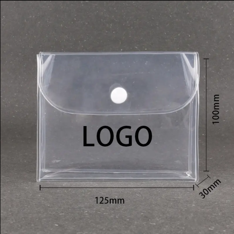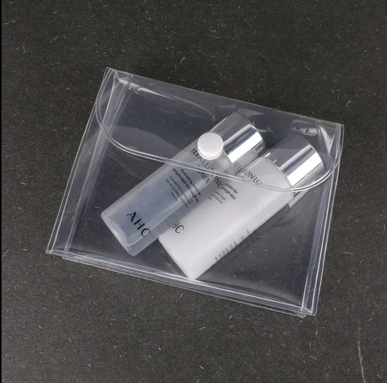 此款透明 PVC 化妝包採用壓扣封口設計,便於收納旅行瓶罐、個人盥洗用品與化妝品。袋身輕便、透明且可視性高,適合日常使用或品牌贈品用途,亦可根據需求客製尺寸與印刷設計。