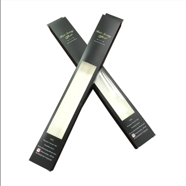 This sleek black rectangular paper box with a clear PVC window offers an elegant and functional packaging solution for hair extensions, wigs, and hairpieces. The window design ensures clear product visibility while maintaining a premium presentation, making it perfect for retail shelves or direct-to-customer packaging.