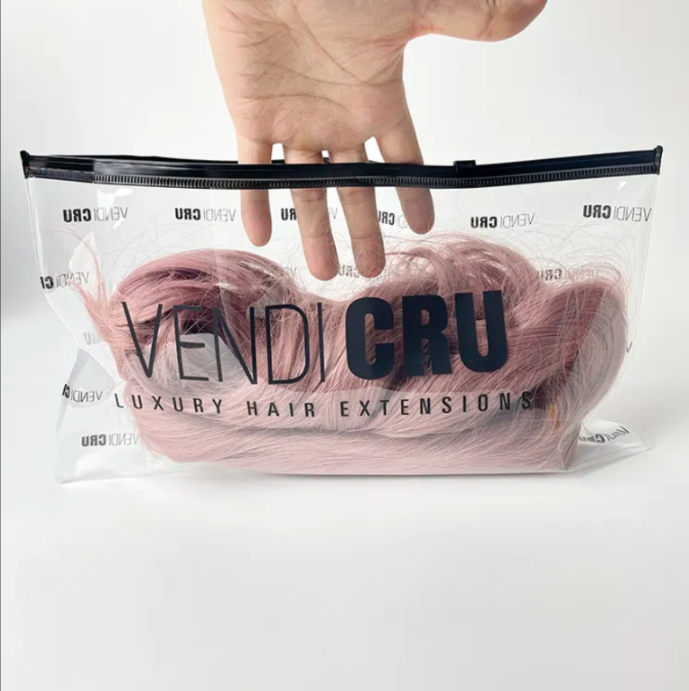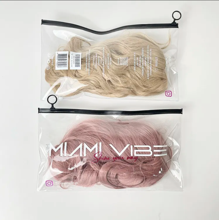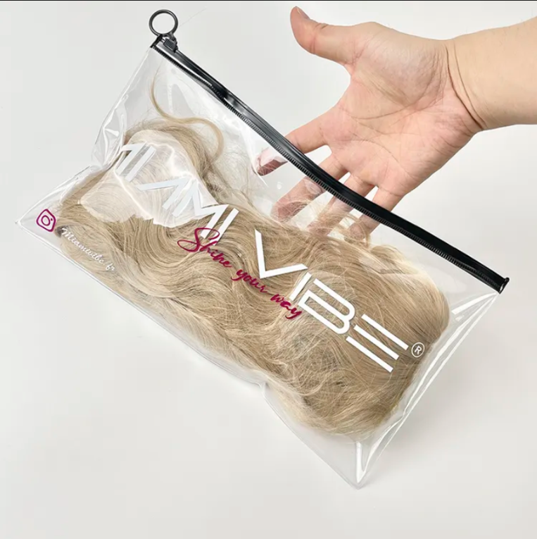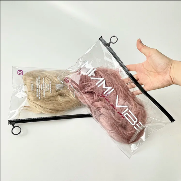 This custom PVC zipper bag is designed to showcase wig products with clarity and style. Featuring a smooth zip closure and a circular pull ring, it offers both convenience and a touch of branding. Perfect for packaging, shipping, and in-store display of wigs and extensions.