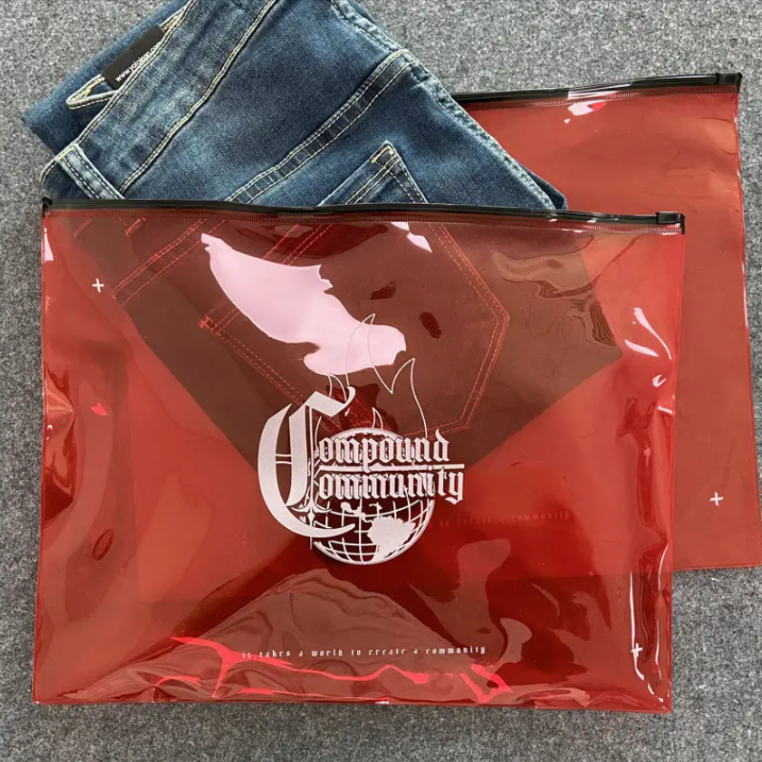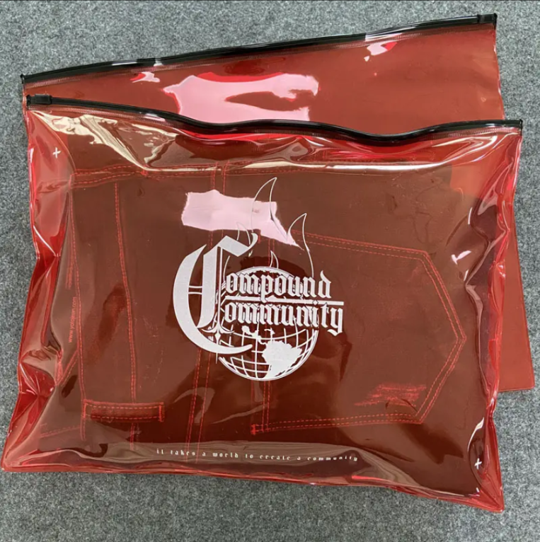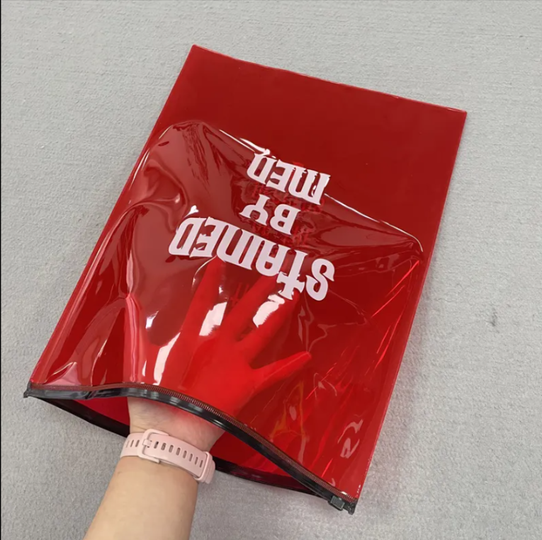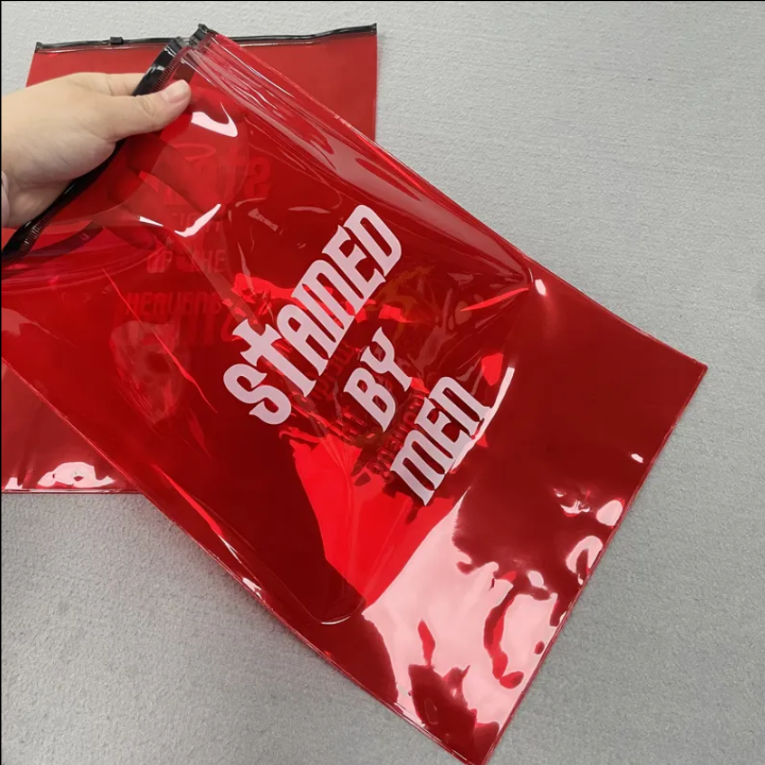 This transparent red PVC slider bag offers both eye-catching presentation and functional protection for your apparel and accessory items. The smooth-sliding seal design makes it easy to open and close, while the sturdy waterproof PVC material ensures durability. Custom logo printing and color options enhance brand visibility, making it perfect for retail and online sales.