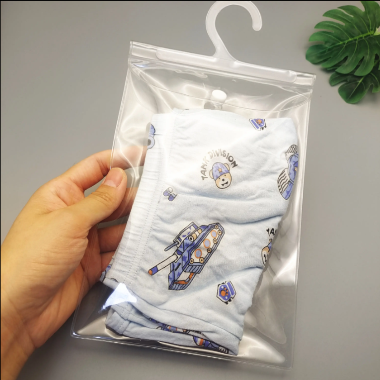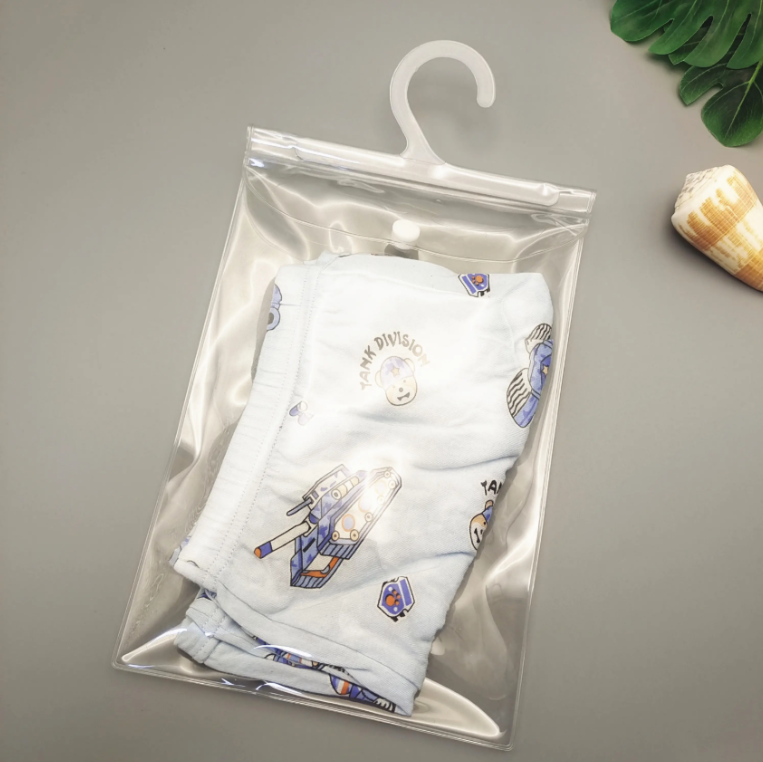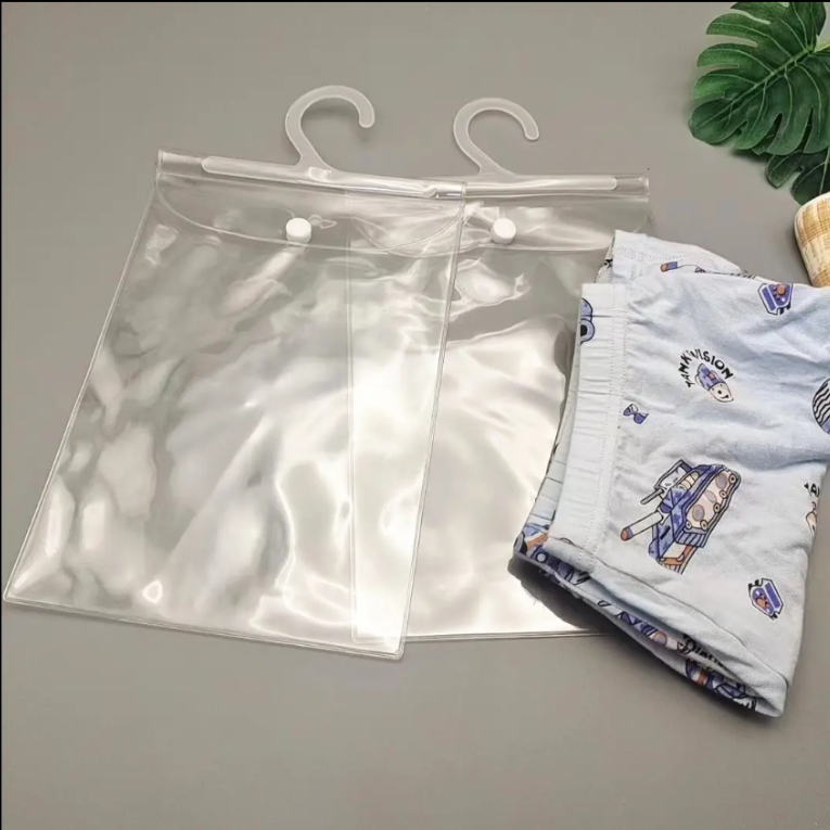 This transparent PVC flat packaging bag is designed for soft apparel items such as underwear and T-shirts. Featuring a clear front for display, durable material, snap-button closure, and a plastic hanger, it offers excellent visibility and utility for both retail and e-commerce. Fully customizable in size and printing for enhanced branding.