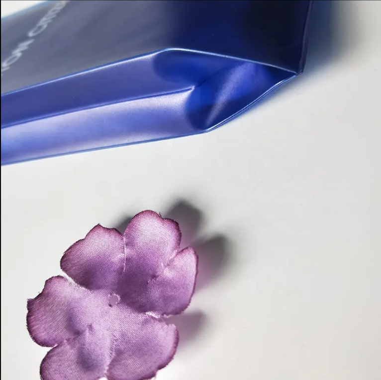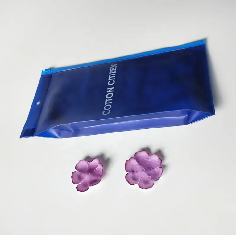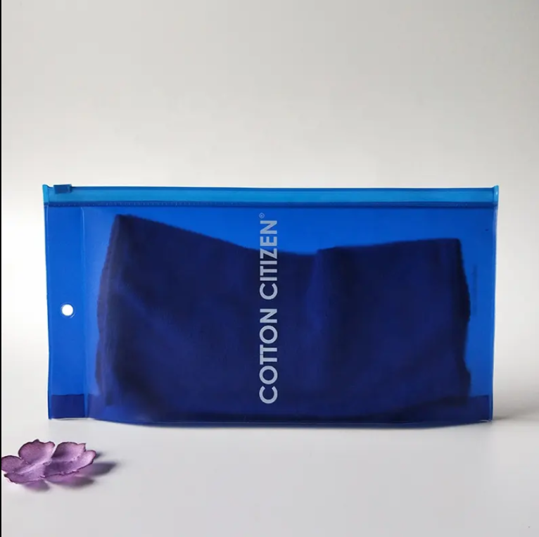 This custom PVC bag features a gusseted (3D) structure with a blue-tinted transparent finish. The zipper closure allows for easy access and reuse, while the hanging hole makes it perfect for retail display. It is suitable for soft garments like underwear, T-shirts, and coordinated sets. Full customization of size and logo printing is available, offering both practicality and brand visibility.