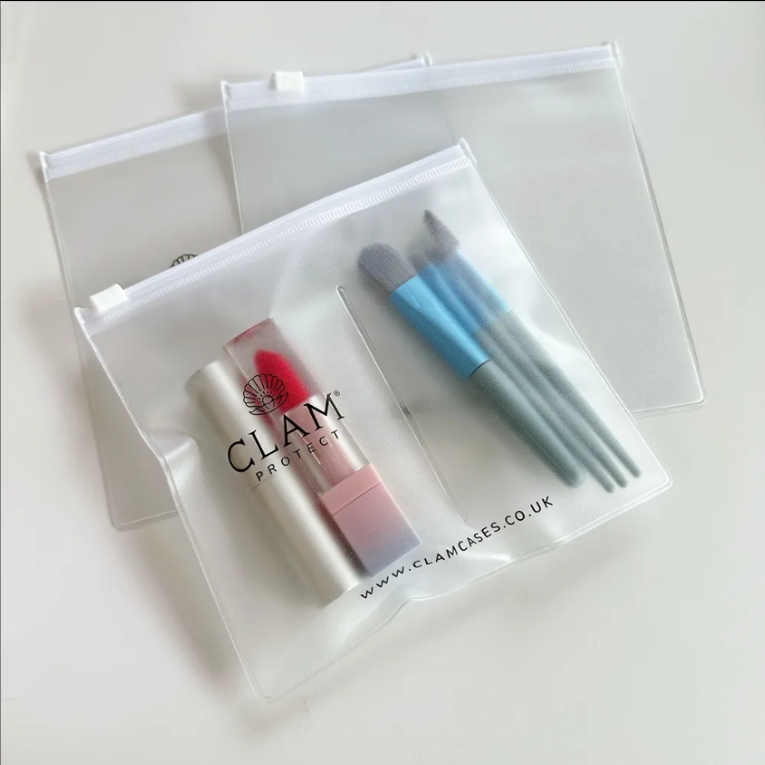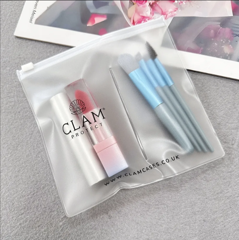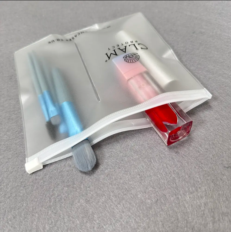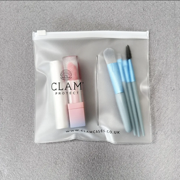 This dual-compartment cosmetic pouch is made of matte PVC and designed to neatly organize makeup brushes, lipsticks, and other small beauty tools. The zip closure ensures secure and convenient use, making it perfect for both personal and professional cosmetic storage. Custom logo printing and size options are available, making it an excellent choice for beauty brands.