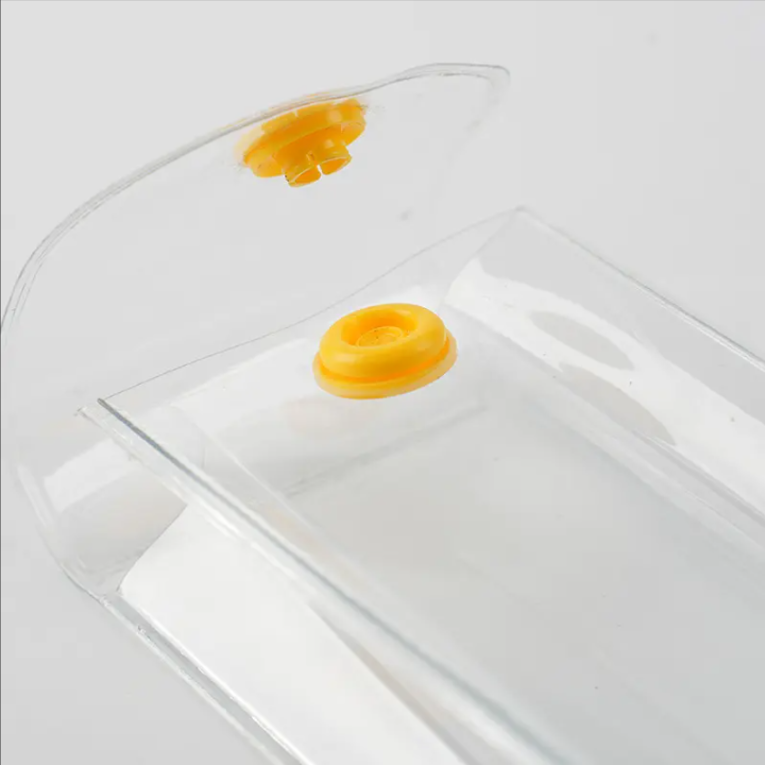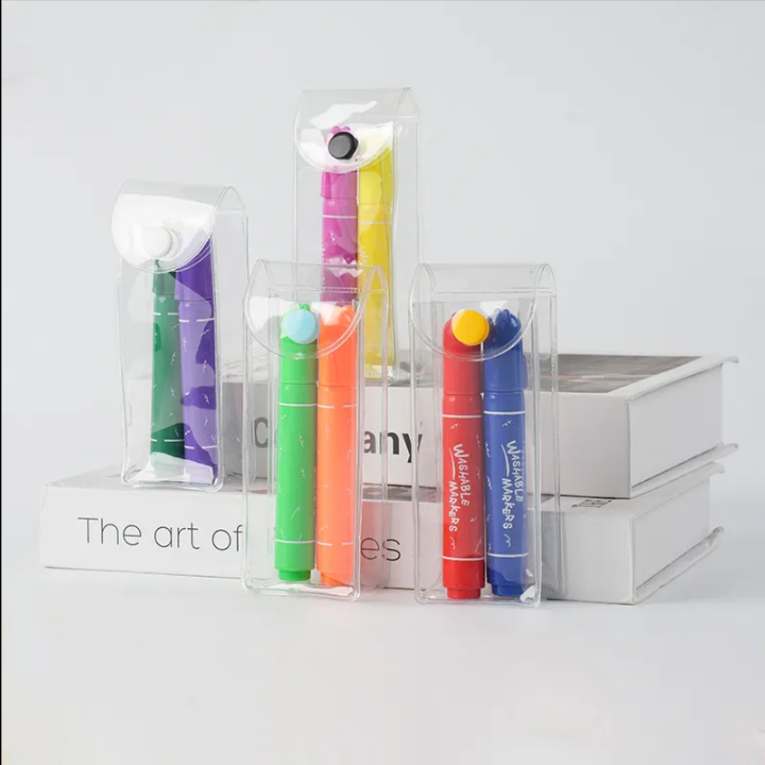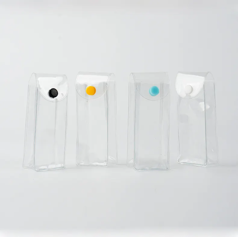 Crafted from high-transparency PVC, this stand-up pen pouch features a stable 3D structure for convenient desk or travel use. The snap-button closure allows quick access while keeping items secure. Perfect for organizing pens, makeup brushes, or small tools. Custom printing and sizing options make it a practical packaging solution for gifts or brand merchandise.