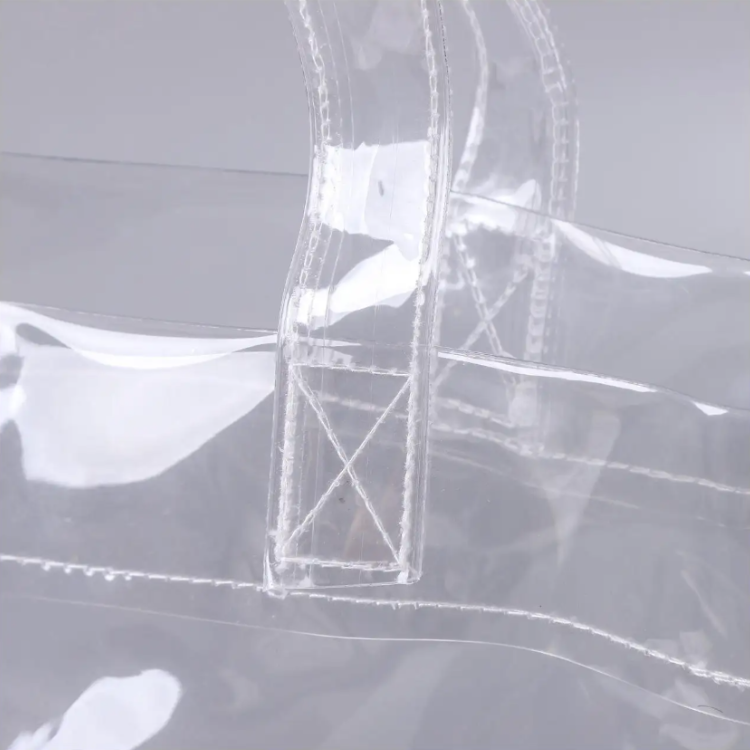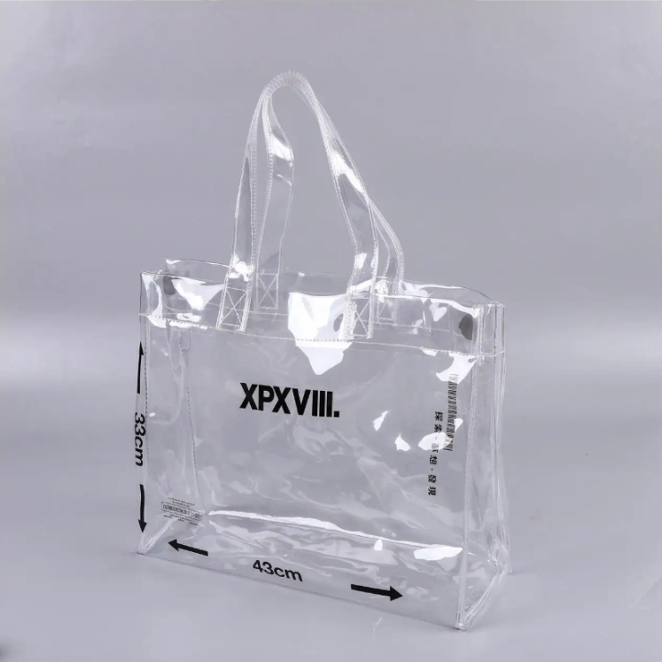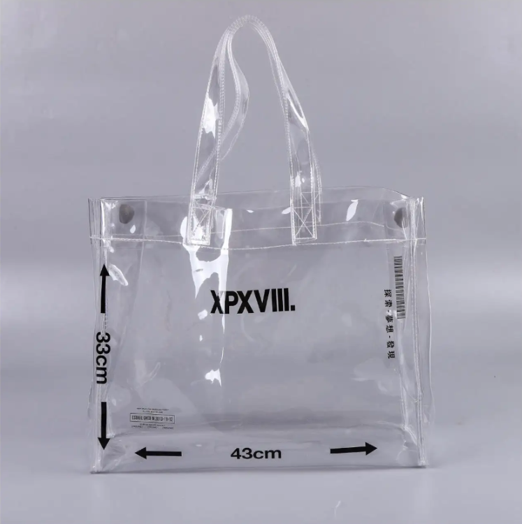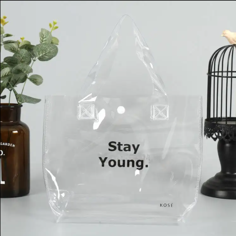 This transparent PVC shopping bag is made with durable material and features a snap closure for a stylish and practical finish. It can be printed with your brand logo or custom design, making it ideal for enhancing retail packaging. The structure supports reuse, suitable for a wide range of apparel, boutique, or promotional uses.