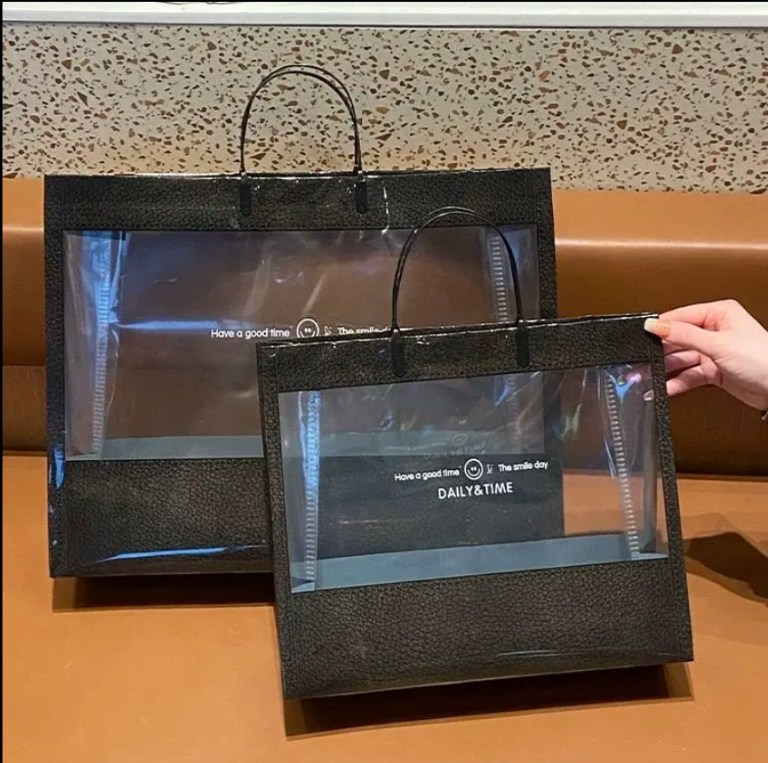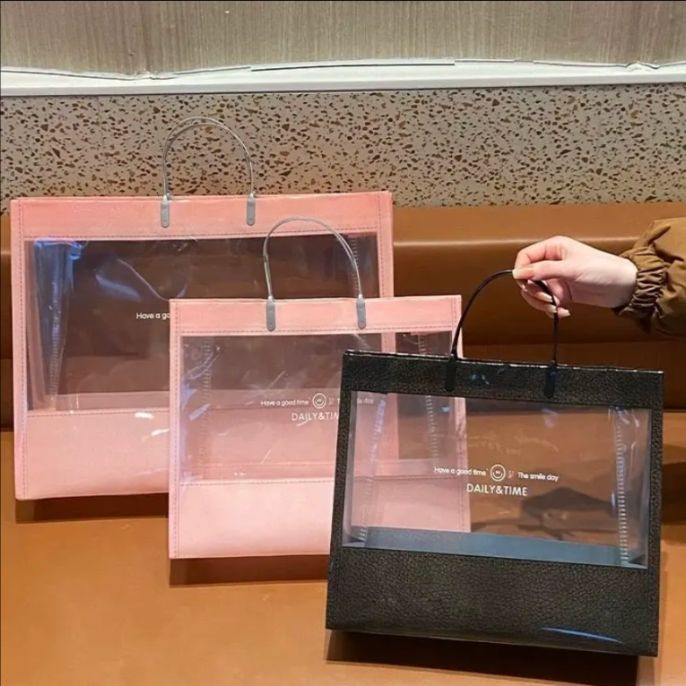 This reusable tote bag is crafted from transparent PVC for optimal product visibility and durability. Its open-top design makes it convenient for retail settings such as fashion boutiques, beauty stores, and gift shops. Custom sizes and logo printing are available to suit your brand’s unique presentation and packaging needs.