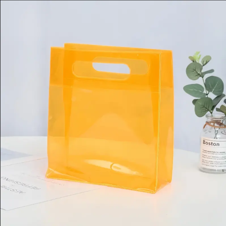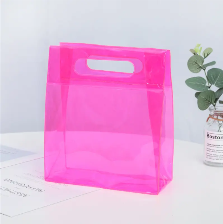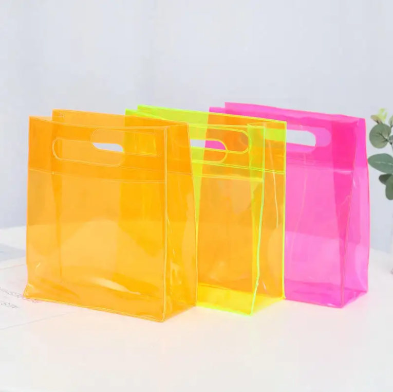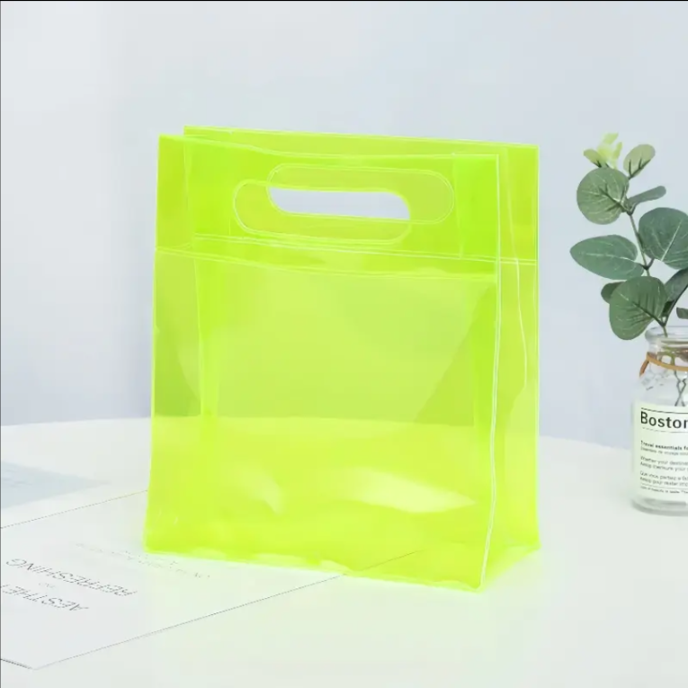 This custom neon PVC gift bag features a stylish die-cut handle design and vibrant colors, making it perfect for party favors, brand promotions, and boutique retail packaging. The high-transparency material enhances visual appeal, while optional logo printing reinforces brand identity.